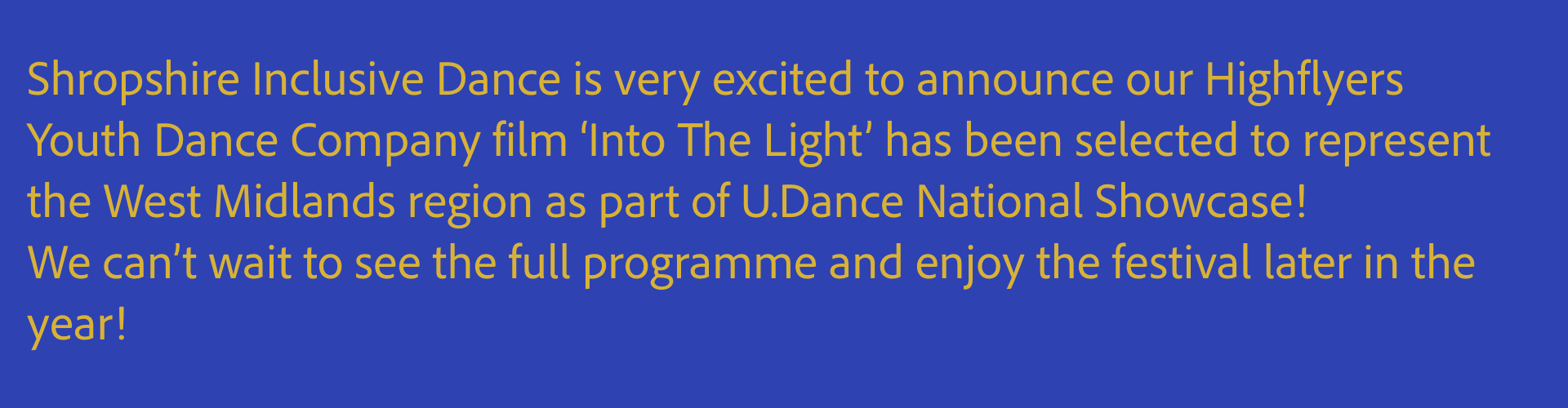 Shropshire Inclusive Dance would like to thank the feast festival for inviting us to be part of a very special festival and JTV for supporting our production with high quality lighting and sound.